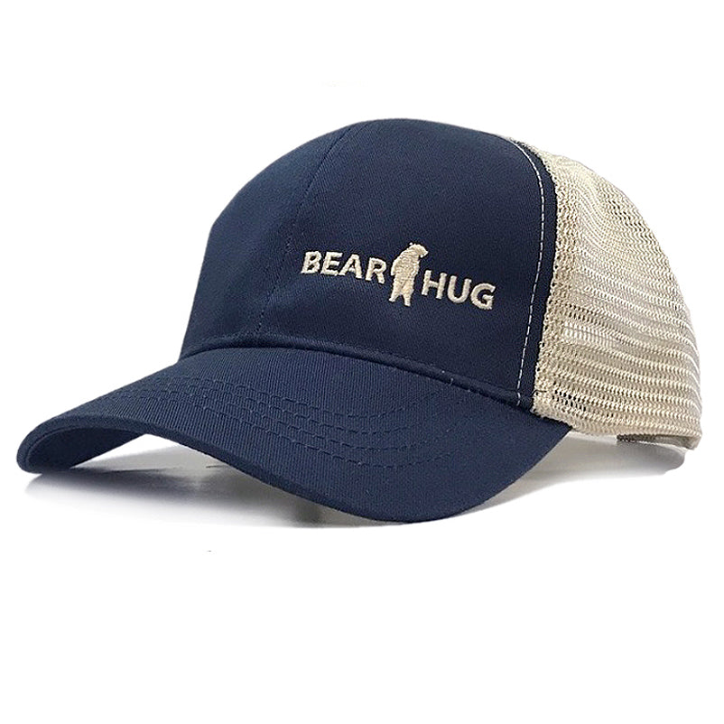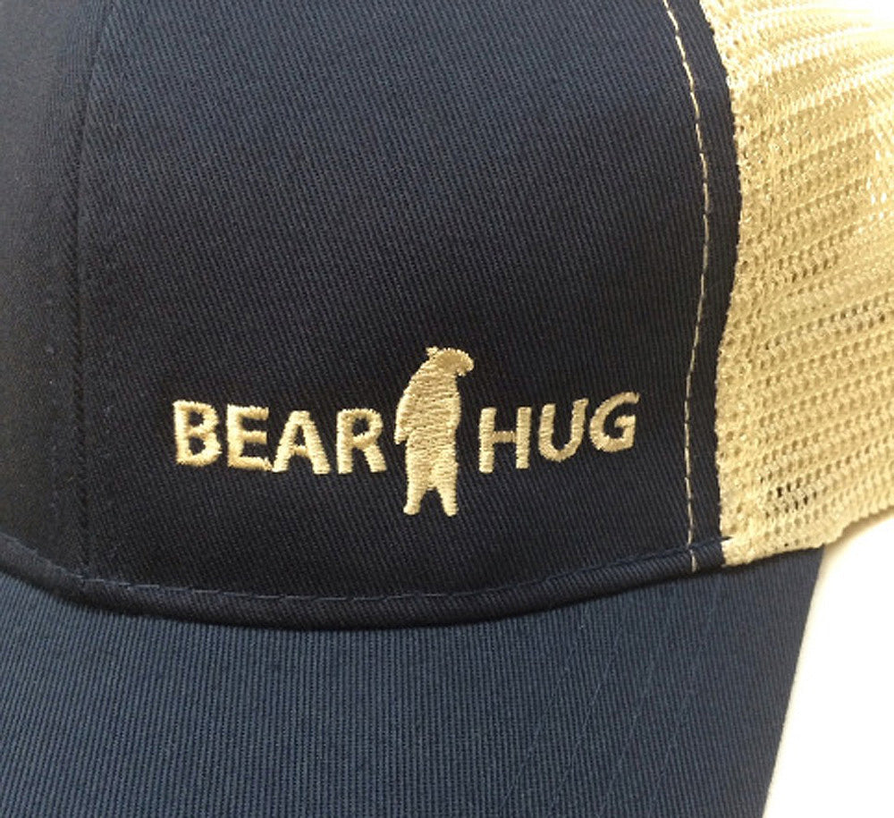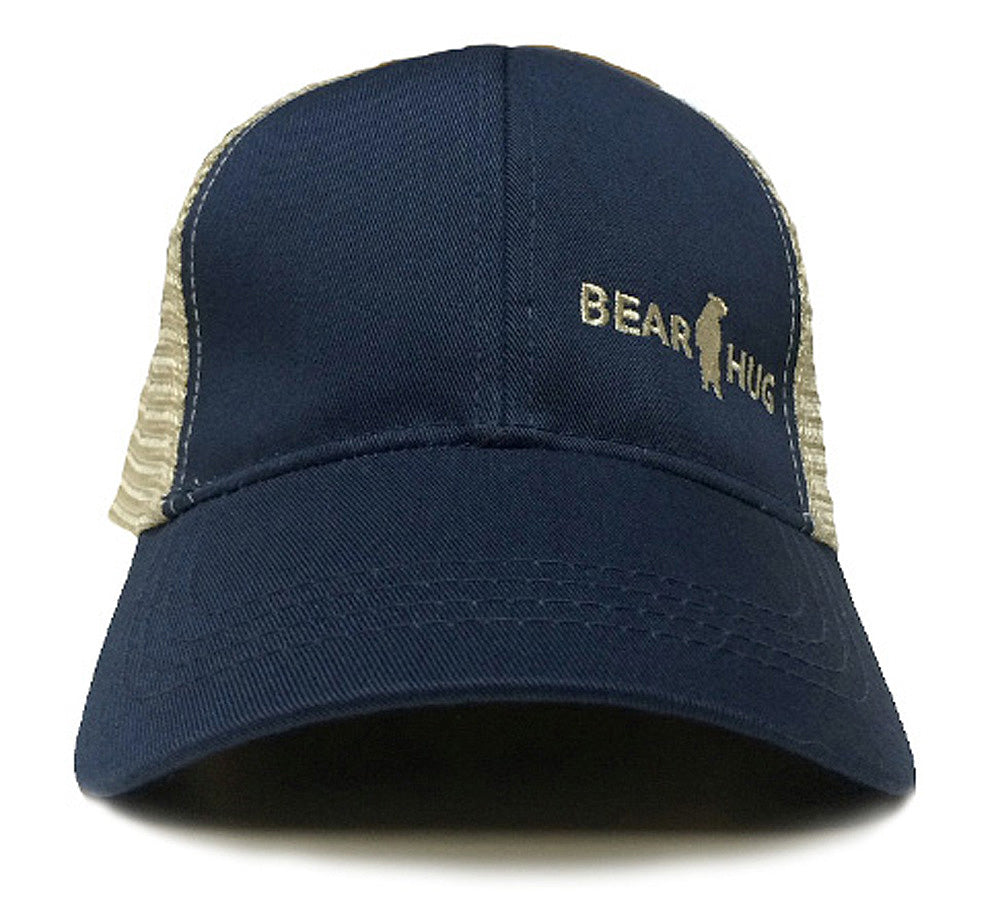 Sexy cool bear hug trucker-style cap for all your fun daytime and nighttime headwear needs! Seriously awesome design, and the fit on this bad boy is incredible. Navy trucker-style cap with navy front/tan contrast mesh side panels.