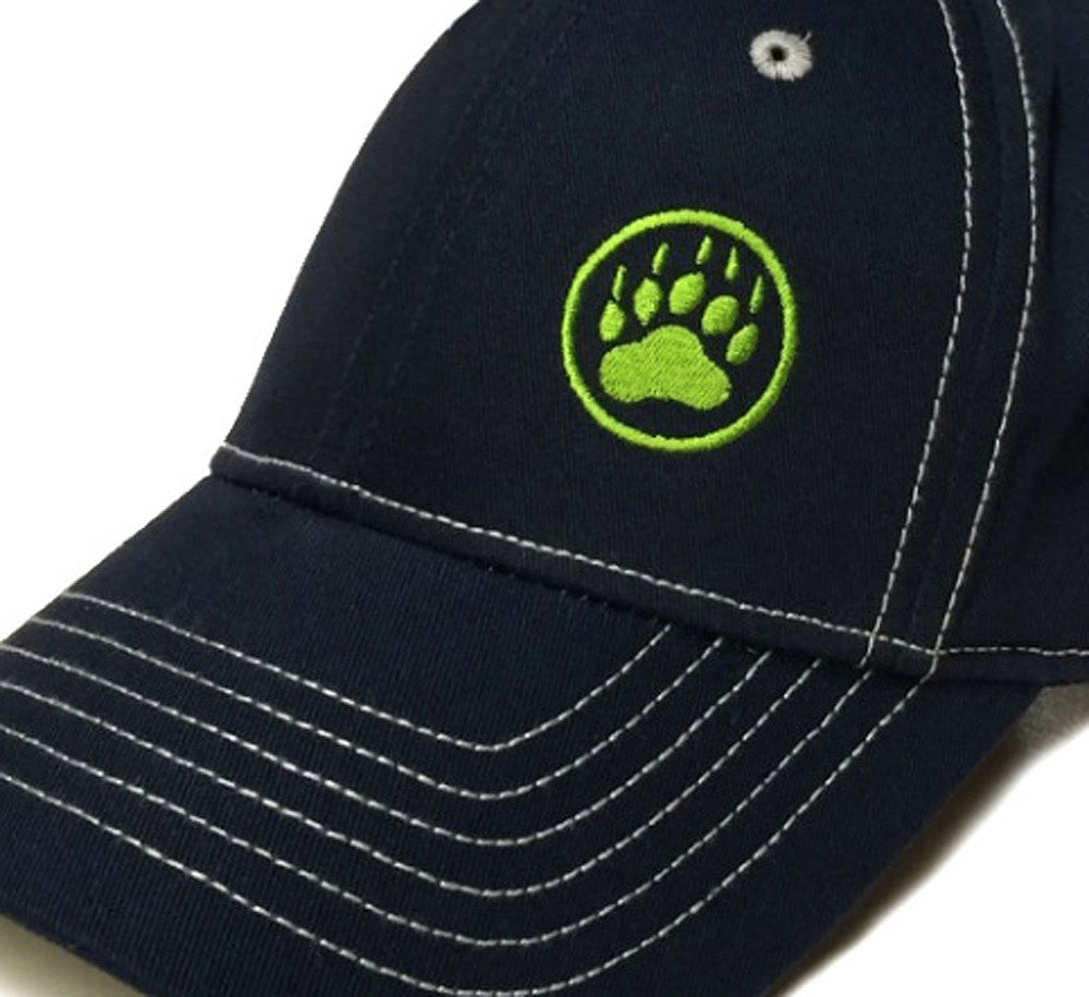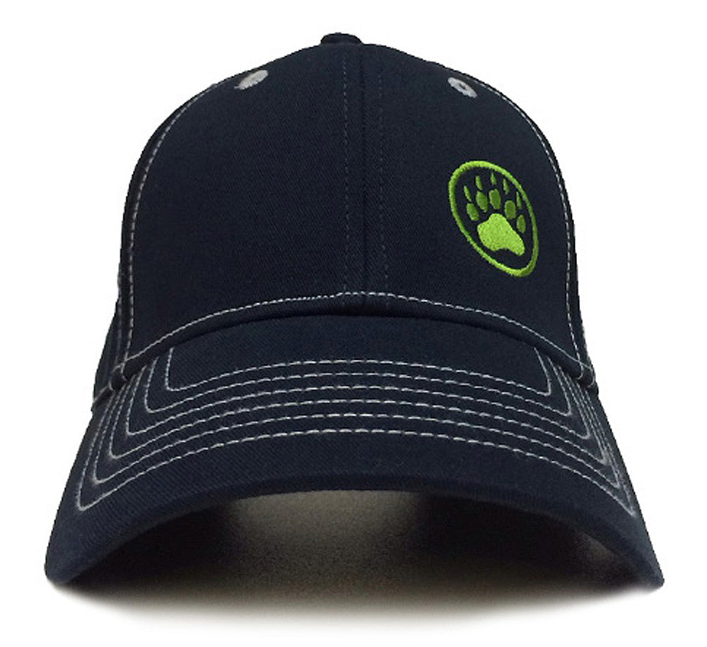 Sporty collegiate, updated tech color palette. Hanging with your buddies this weekend? Are you buddies big hot hairy muscle dudes that tend to woof and growl at you? You know dude, you need our re-worked Bear Paw Logo Cap in Navy and bust this sexy bad boy cap out in front of them. Dude...maybe you are a bear or are bear-curious...whatever...it's fun and sexy. Neon green embroidery on a navy cap with contrast grey stitching...but wait there's more. This super sport pro-style cap is a 100% chino cotton twill, 6-panel structured cap with contrast eyelets, contrast stitch on crown & bill, six rows of stitching on visor, matching fabric under-visor, and with a matching Velcro closure (which I personally love, the best of all worlds closure). The best fitting cap you can ever own dudes.