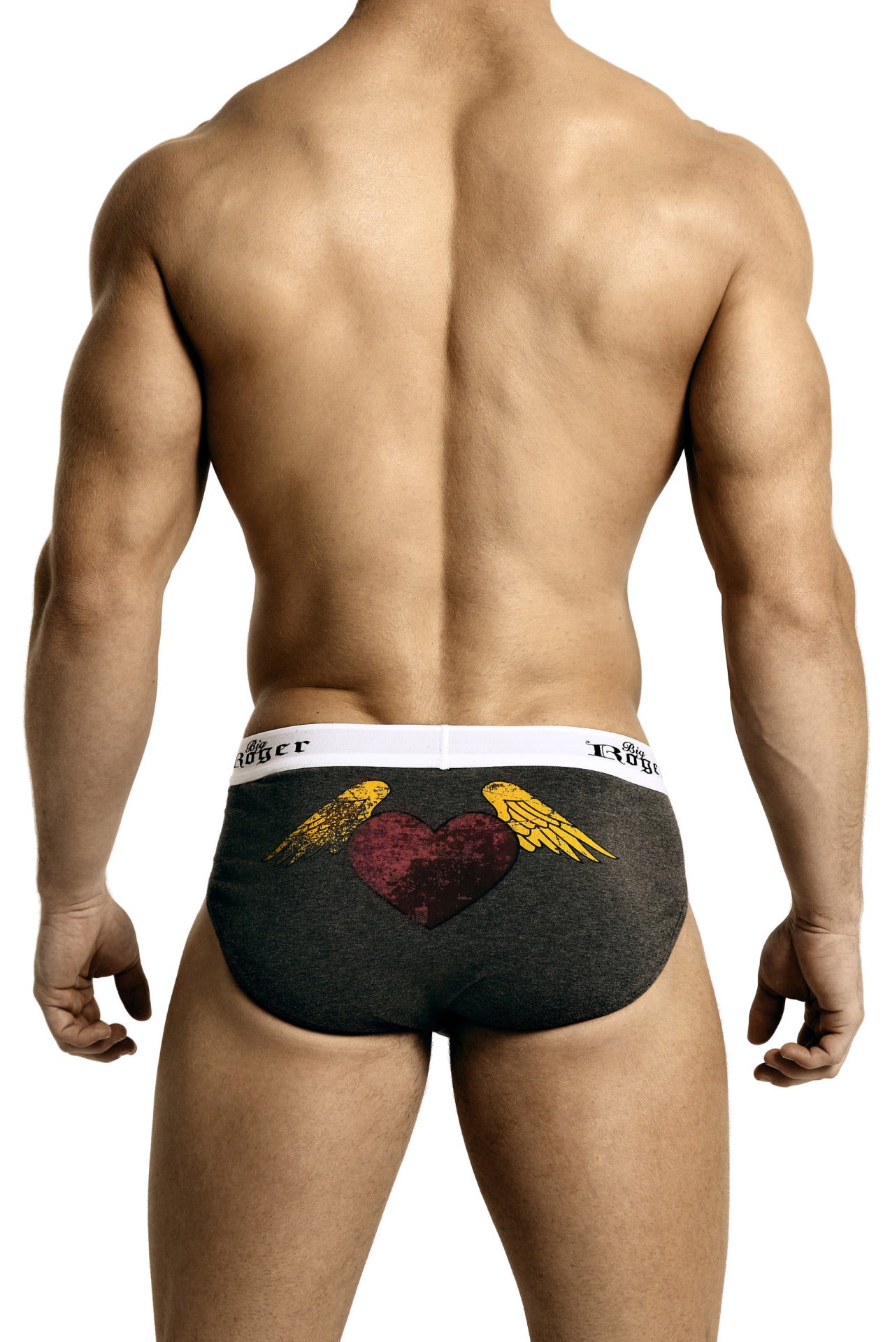 These contour men's briefs feature a white Big Roger Graphic logo waistband. Big Roger distressed "Winged Heart" graphic in deep red and gold add a sexy addition-center placement on rear. Seamless sides and back make these briefs very low-profile under clothes. Single Layer contour pouch adds sexy support exactly where you need it.