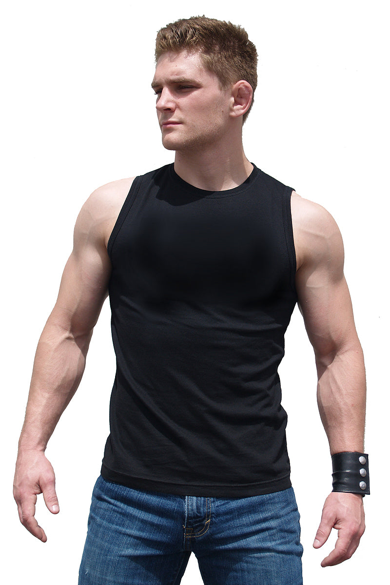 Forget bareback...go bare front with ajaxx63's hot athletic fit sleeveless muscle tees available with no graphics in your favorite colors. This sleeveless barefront tee is perfectly cut for ease of movement, and the opening is designed to hit your shoulder and traps at the most flattering location for you. A finished seam gives the shirt the ability to go from the gym to a night out with your buddies.