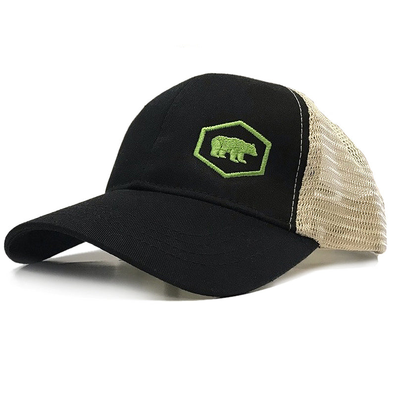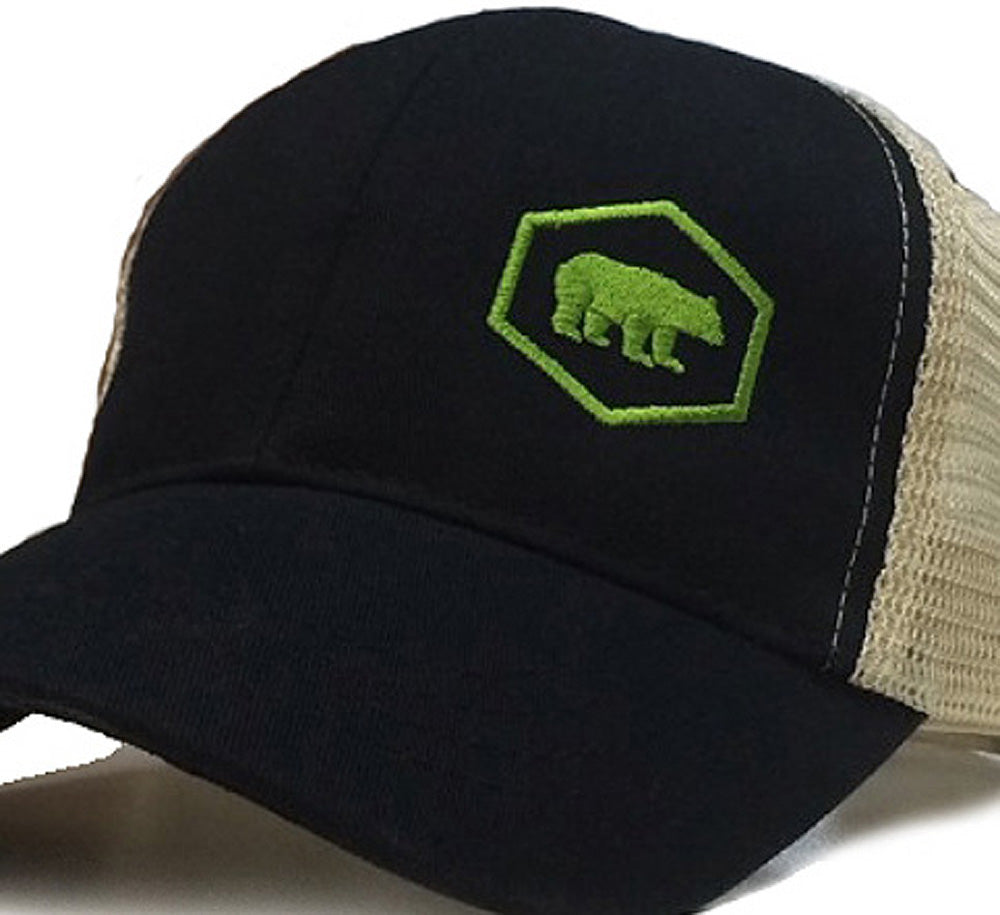 Sexy cool Tech Bear trucker-style cap for all your fun daytime and night time headwear needs! Seriously awesome design, and the fit on this bad boy is incredible. Black trucker-style cap with black front/tan contrast mesh side panels.