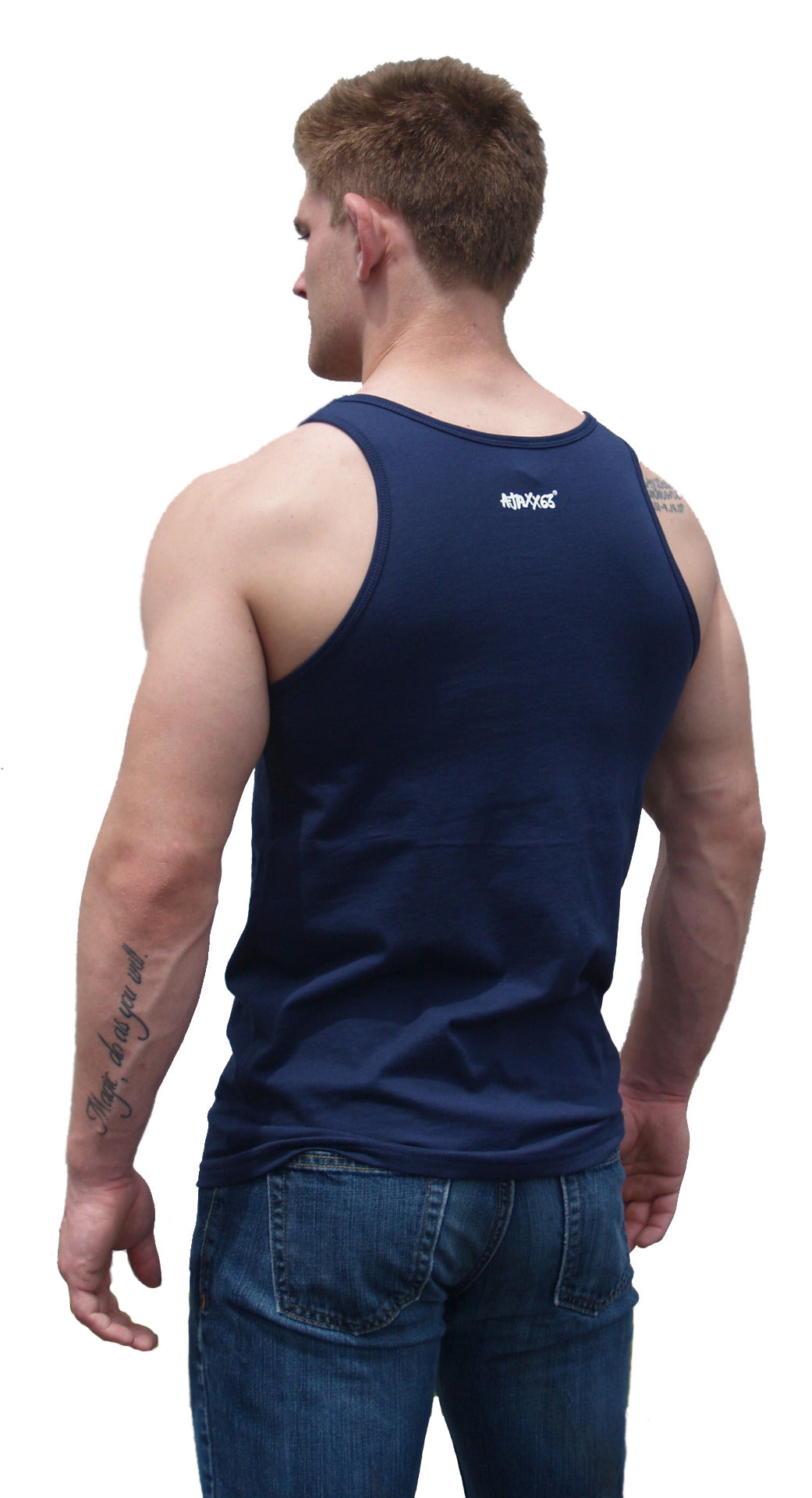 Woof stripped tank. The sexy new graphic tank top on the block. Cute, bright-eyed, eager, energetic, huggable. A sporty interpretation of the woof theme - naughty, sexy, late night, gym, beach, or city tank top. One color white, silk-screened graphic on a navy tank top. Featuring a durable ribbed neckline, as well as durable ribbed arm openings.
