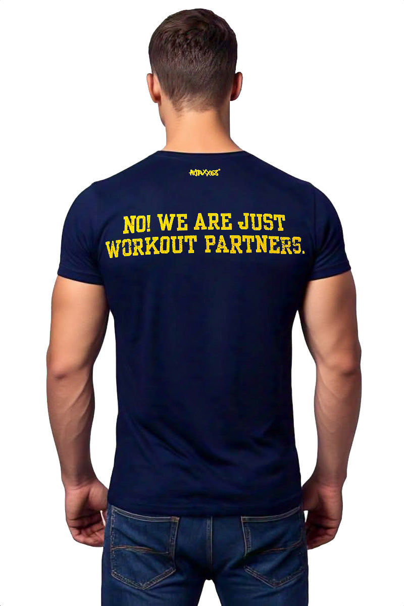 From our Heritage Collection. One of our signature designs updated for all you guys that workout and people keep wondering what's going on between you gents. College gold silk-screened graphic on a navy, lightweight, great-fitting premium tee.